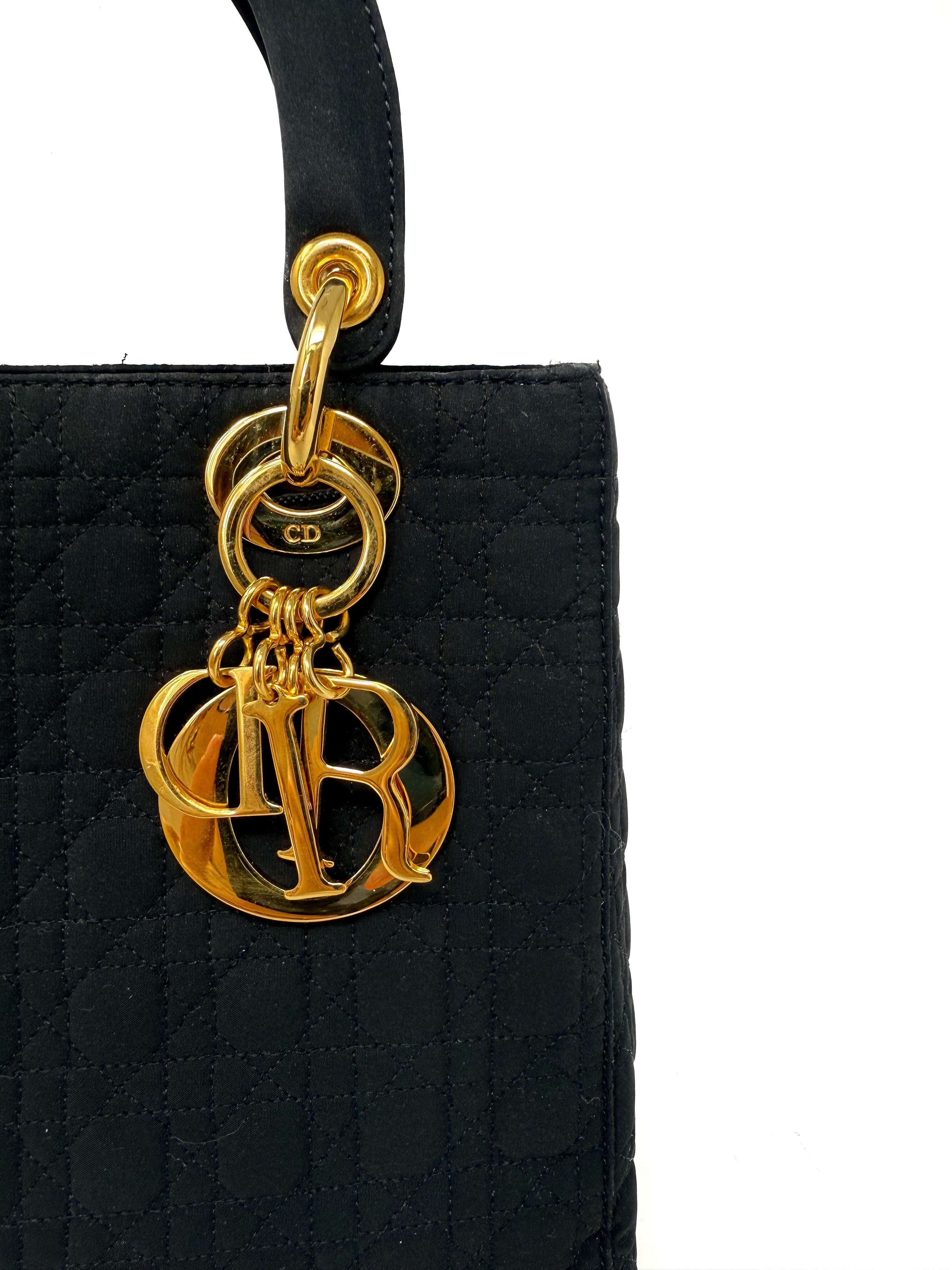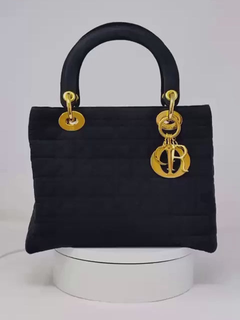 现已发售:一款优雅的黑色帆布 Lady Dior 手袋,饰有标志性的藤格纹缝线和金色 Dior 字母吊饰。这款永恒的收藏品完美诠释了巴黎奢华的精致格调。